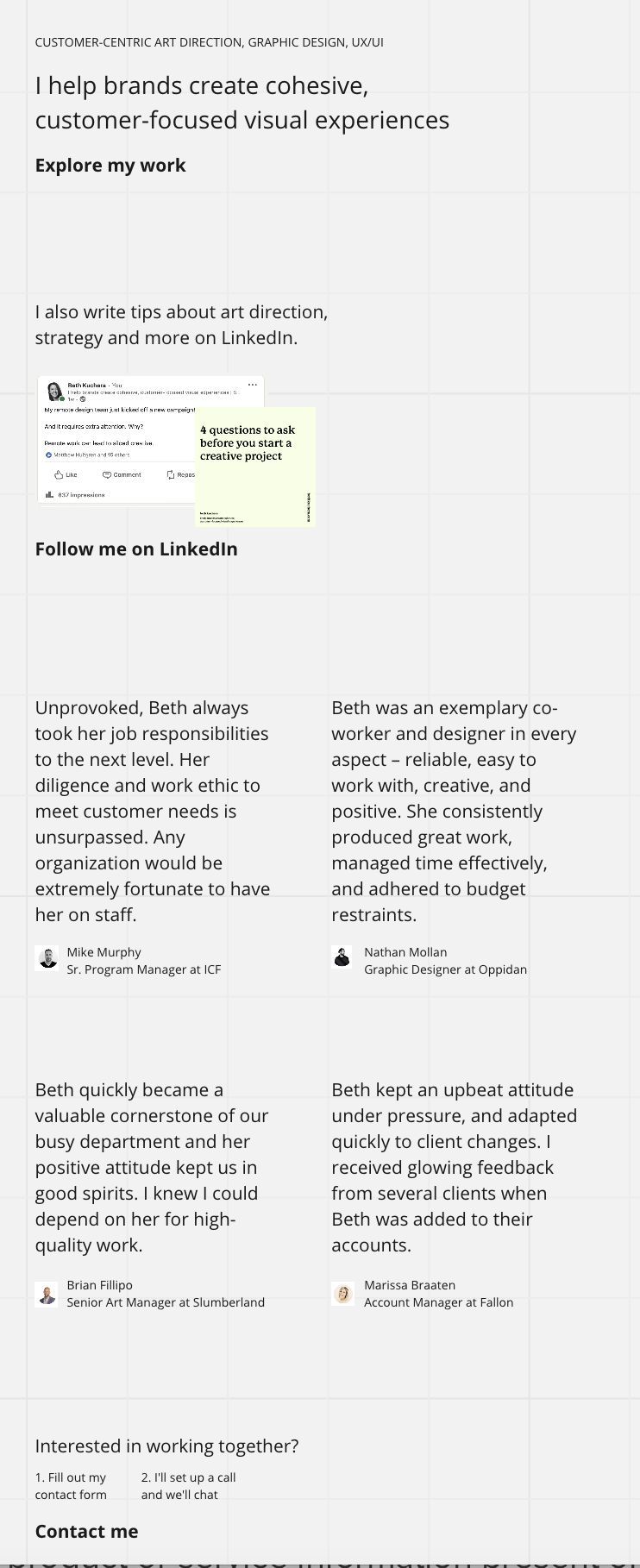 (ctrl+F)Graphic Design, Art Direction, Time Management, Adobe Creative Suite, Adobe Illustrator, Adobe Photoshop, Adobe InDesign, Adobe Xd, Figma, Team Management, Collaboration, Cross-team Collaboration, Campaign Mindset, Cross-Channel Creative, Design Strategy, Autonomy, Project Management, Brand Standards, Quality Assurance, User Experience, User Research, Heuristic Evaluation, User Testing, Qualitative Research, Present Work, Presentation Design, Communication, Creative Rationale, Use Consumer Insights, Trend Research, Industry Research, Branding Materials, Marketing Materials, Advertising Materials, Event Design, Print Design, Logo Design, Typography, Branding & Identity, Cinema4D, Microsoft Office, Microsoft Word, Microsoft PowerPoint